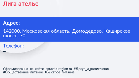 Лига, ателье по адресу 142000, Московская область, Домодедово, Каширское шоссе, 70 в дальнейшем Организация, размещена в следующих категориях: