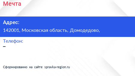 Мечта по адресу 142001, Московская область, Домодедово, в дальнейшем Организация, размещена в следующих категориях: