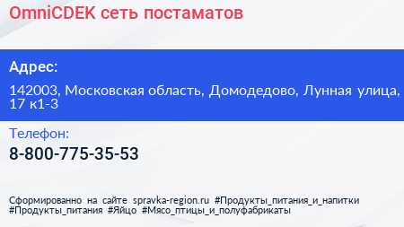 OmniCDEK, сеть постаматов по адресу 142003, Московская область, Домодедово, Лунная улица, 17 к1-3 в дальнейшем Организация, размещена в следующих категориях: