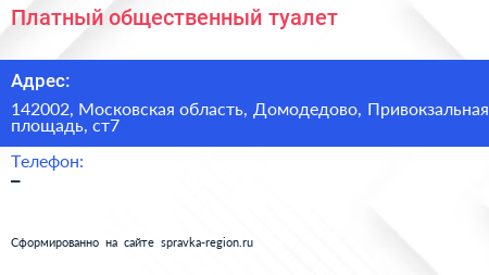 Платный общественный туалет по адресу 142002, Московская область, Домодедово, Привокзальная площадь, ст7 в дальнейшем Организация, размещена в следующих категориях: