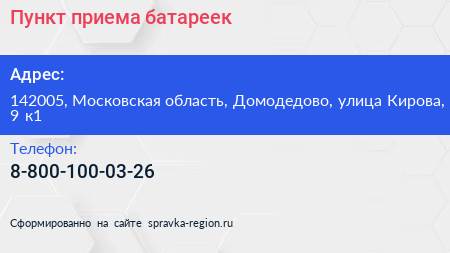 Пункт приема батареек по адресу 142005, Московская область, Домодедово, улица Кирова, 9 к1 в дальнейшем Организация, размещена в следующих категориях: