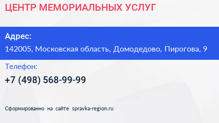 ЦЕНТР МЕМОРИАЛЬНЫХ УСЛУГ по адресу 142005, Московская область, Домодедово, Пирогова, 9 в дальнейшем Организация, размещена в следующих категориях: