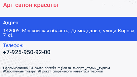 Арт, салон красоты по адресу 142005, Московская область, Домодедово, улица Кирова, 7 к1 в дальнейшем Организация, размещена в следующих категориях: