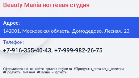 Beauty Mania, ногтевая студия по адресу 142001, Московская область, Домодедово, Лесная, 23 в дальнейшем Организация, размещена в следующих категориях: