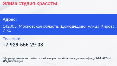 Элиза, студия красоты по адресу 142005, Московская область, Домодедово, улица Кирова, 7 к1 в дальнейшем Организация, размещена в следующих категориях: