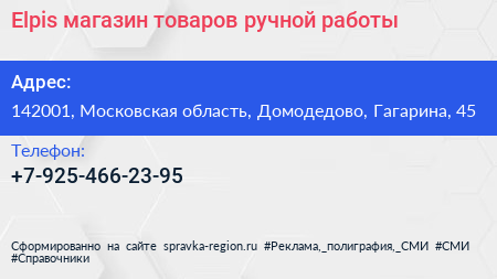 Elpis, магазин товаров ручной работы по адресу 142001, Московская область, Домодедово, Гагарина, 45 в дальнейшем Организация, размещена в следующих категориях: