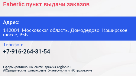 Faberlic, пункт выдачи заказов по адресу 142004, Московская область, Домодедово, Каширское шоссе, 95Б в дальнейшем Организация, размещена в следующих категориях: