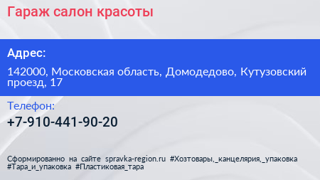 Гараж, салон красоты по адресу 142000, Московская область, Домодедово, Кутузовский проезд, 17 в дальнейшем Организация, размещена в следующих категориях: