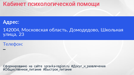 Кабинет психологической помощи по адресу 142004, Московская область, Домодедово, Школьная улица, 23 в дальнейшем Организация, размещена в следующих категориях: