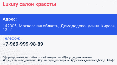 Luxury, салон красоты по адресу 142005, Московская область, Домодедово, улица Кирова, 13 к1 в дальнейшем Организация, размещена в следующих категориях: