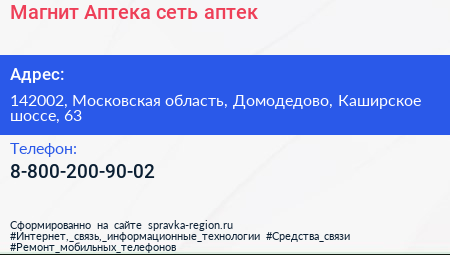Магнит Аптека, сеть аптек по адресу 142002, Московская область, Домодедово, Каширское шоссе, 63 в дальнейшем Организация, размещена в следующих категориях: