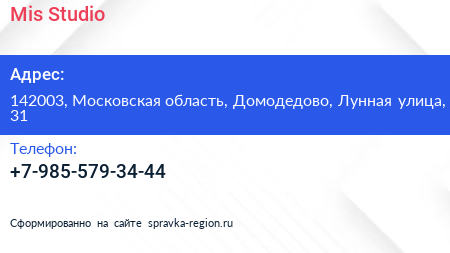 Mis. Studio по адресу 142003, Московская область, Домодедово, Лунная улица, 31 в дальнейшем Организация, размещена в следующих категориях: