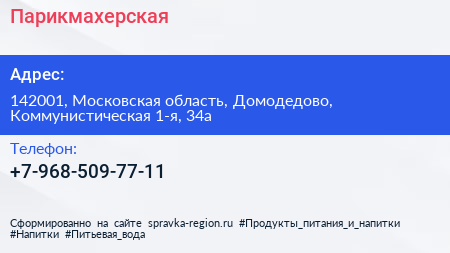Парикмахерская по адресу 142001, Московская область, Домодедово, Коммунистическая 1-я, 34а в дальнейшем Организация, размещена в следующих категориях: