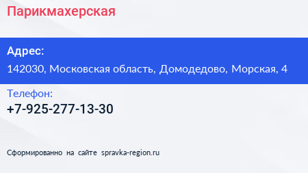 Парикмахерская по адресу 142030, Московская область, Домодедово, Морская, 4 в дальнейшем Организация, размещена в следующих категориях: