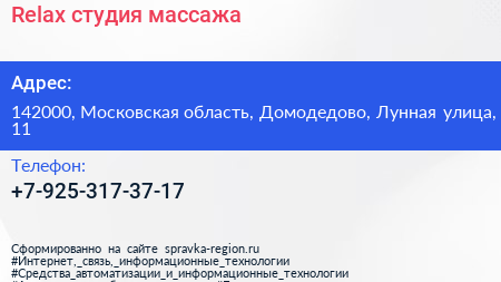 Relax, студия массажа по адресу 142000, Московская область, Домодедово, Лунная улица, 11 в дальнейшем Организация, размещена в следующих категориях: