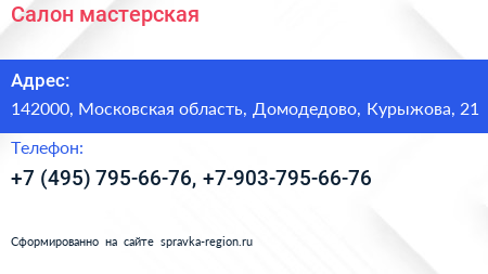 Салон-мастерская по адресу 142000, Московская область, Домодедово, Курыжова, 21 в дальнейшем Организация, размещена в следующих категориях: