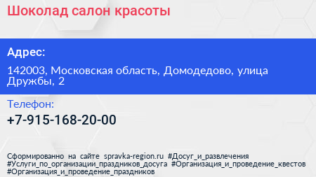 Шоколад, салон красоты по адресу 142003, Московская область, Домодедово, улица Дружбы, 2 в дальнейшем Организация, размещена в следующих категориях: