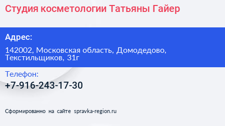Студия косметологии Татьяны Гайер по адресу 142002, Московская область, Домодедово, Текстильщиков, 31г в дальнейшем Организация, размещена в следующих категориях: