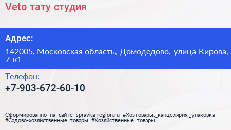 Veto, тату-студия по адресу 142005, Московская область, Домодедово, улица Кирова, 7 к1 в дальнейшем Организация, размещена в следующих категориях: