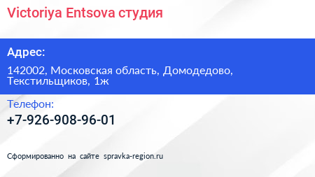 Victoriya Entsova, студия по адресу 142002, Московская область, Домодедово, Текстильщиков, 1ж в дальнейшем Организация, размещена в следующих категориях: