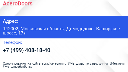 AceroDoors по адресу 142002, Московская область, Домодедово, Каширское шоссе, 17а в дальнейшем Организация, размещена в следующих категориях: