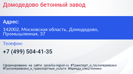 Домодедово, бетонный завод по адресу 142002, Московская область, Домодедово, Промышленная, 37 в дальнейшем Организация, размещена в следующих категориях: