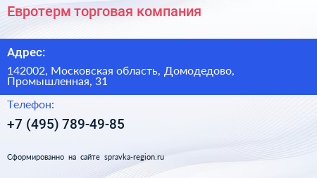 Евротерм, торговая компания по адресу 142002, Московская область, Домодедово, Промышленная, 31 в дальнейшем Организация, размещена в следующих категориях: