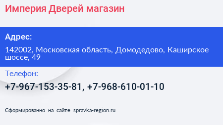 Империя Дверей, магазин по адресу 142002, Московская область, Домодедово, Каширское шоссе, 49 в дальнейшем Организация, размещена в следующих категориях: