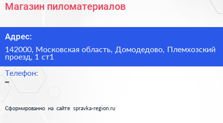 Магазин пиломатериалов по адресу 142000, Московская область, Домодедово, Племхозский проезд, 1 ст1 в дальнейшем Организация, размещена в следующих категориях: