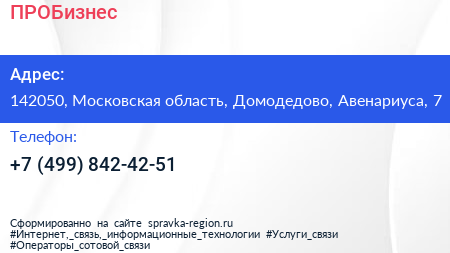 ПРОБизнес по адресу 142050, Московская область, Домодедово, Авенариуса, 7 в дальнейшем Организация, размещена в следующих категориях: