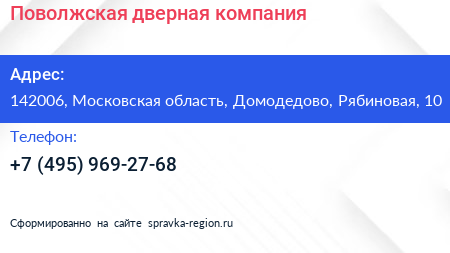 Поволжская дверная компания по адресу 142006, Московская область, Домодедово, Рябиновая, 10 в дальнейшем Организация, размещена в следующих категориях: