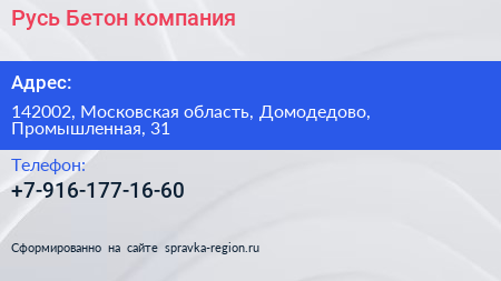 Русь-Бетон, компания по адресу 142002, Московская область, Домодедово, Промышленная, 31 в дальнейшем Организация, размещена в следующих категориях: