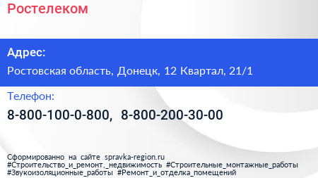 Ростелеком по адресу Ростовская область, Донецк, 12 Квартал, 21/1 в дальнейшем Организация, размещена в следующих категориях: