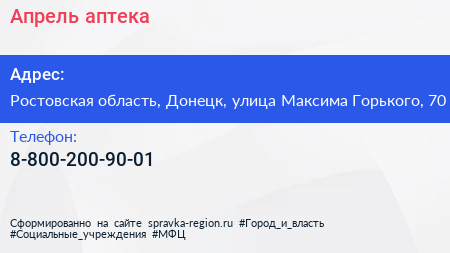 Апрель, аптека по адресу Ростовская область, Донецк, улица Максима Горького, 70 в дальнейшем Организация, размещена в следующих категориях:
