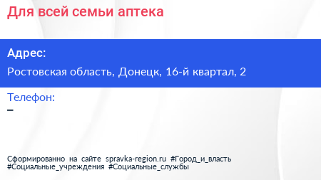 Для всей семьи, аптека по адресу Ростовская область, Донецк, 16-й квартал, 2 в дальнейшем Организация, размещена в следующих категориях: