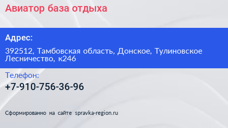 Авиатор, база отдыха по адресу 392512, Тамбовская область, Донское, Тулиновское Лесничество, к246 в дальнейшем Организация, размещена в следующих категориях:
