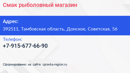 Смак, рыболовный магазин по адресу 392511, Тамбовская область, Донское, Советская, 56 в дальнейшем Организация, размещена в следующих категориях: