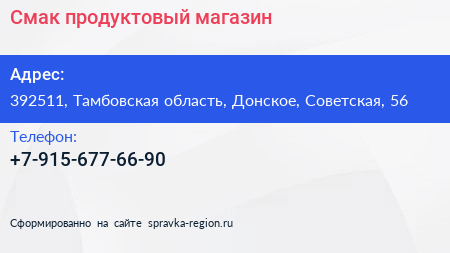 Смак, продуктовый магазин по адресу 392511, Тамбовская область, Донское, Советская, 56 в дальнейшем Организация, размещена в следующих категориях: