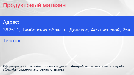 Продуктовый магазин по адресу 392511, Тамбовская область, Донское, Афанасьевой, 25а в дальнейшем Организация, размещена в следующих категориях: