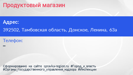 Продуктовый магазин по адресу 392502, Тамбовская область, Донское, Ленина, 63а в дальнейшем Организация, размещена в следующих категориях: