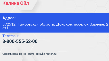 Калина Ойл по адресу 392512, Тамбовская область, Донское, посёлок Заречье, 2 ст1 в дальнейшем Организация, размещена в следующих категориях: