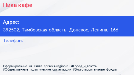 Ника, кафе по адресу 392502, Тамбовская область, Донское, Ленина, 166 в дальнейшем Организация, размещена в следующих категориях: