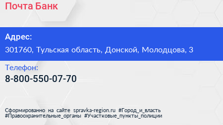 Почта Банк по адресу 301760, Тульская область, Донской, Молодцова, 3 в дальнейшем Организация, размещена в следующих категориях: