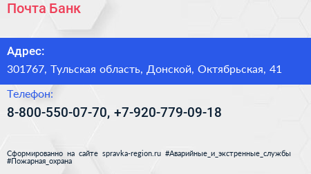 Почта Банк по адресу 301767, Тульская область, Донской, Октябрьская, 41 в дальнейшем Организация, размещена в следующих категориях: