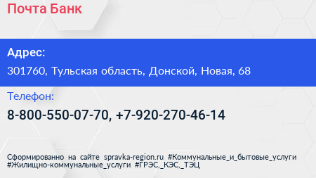 Почта Банк по адресу 301760, Тульская область, Донской, Новая, 68 в дальнейшем Организация, размещена в следующих категориях: