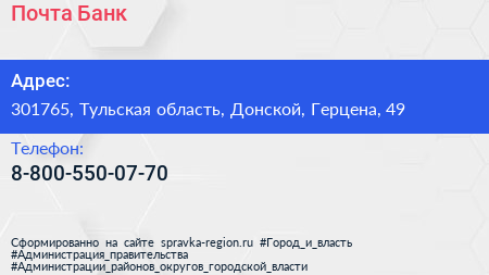 Почта Банк по адресу 301765, Тульская область, Донской, Герцена, 49 в дальнейшем Организация, размещена в следующих категориях: