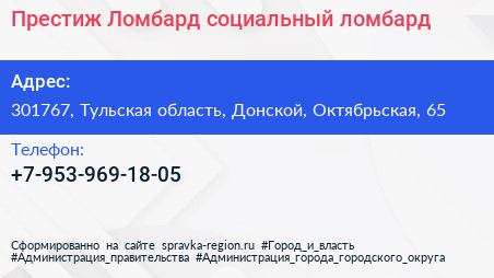 Престиж Ломбард, социальный ломбард по адресу 301767, Тульская область, Донской, Октябрьская, 65 в дальнейшем Организация, размещена в следующих категориях: