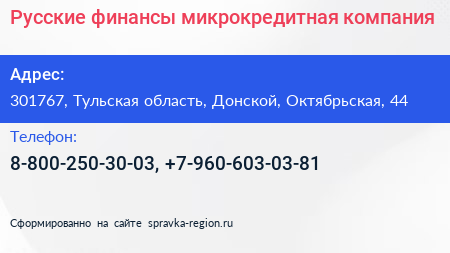 Русские финансы, микрокредитная компания по адресу 301767, Тульская область, Донской, Октябрьская, 44 в дальнейшем Организация, размещена в следующих категориях:
