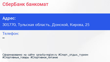 СберБанк, банкомат по адресу 301770, Тульская область, Донской, Кирова, 25 в дальнейшем Организация, размещена в следующих категориях: