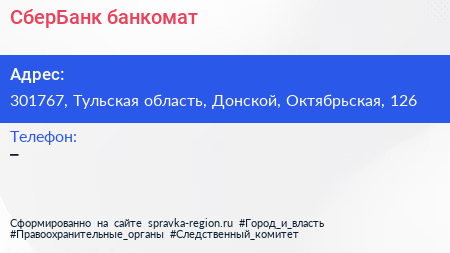 СберБанк, банкомат по адресу 301767, Тульская область, Донской, Октябрьская, 126 в дальнейшем Организация, размещена в следующих категориях: